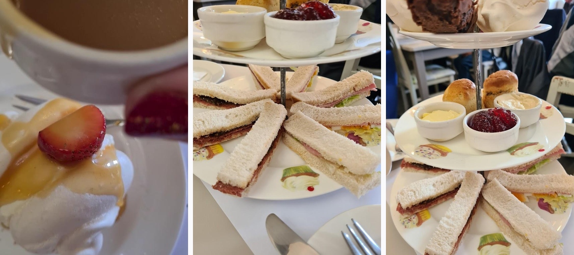 Fantastic afternoon tea. Had a voucher for Christmas for luxury afternoon tea. Sandwiches really fresh with delicious ingredients. Nice fillings choices. Different as no cake as such. A cream filled meringue with hot toffee sauce and a piece of tiffin and a scone each. Very tasty and different